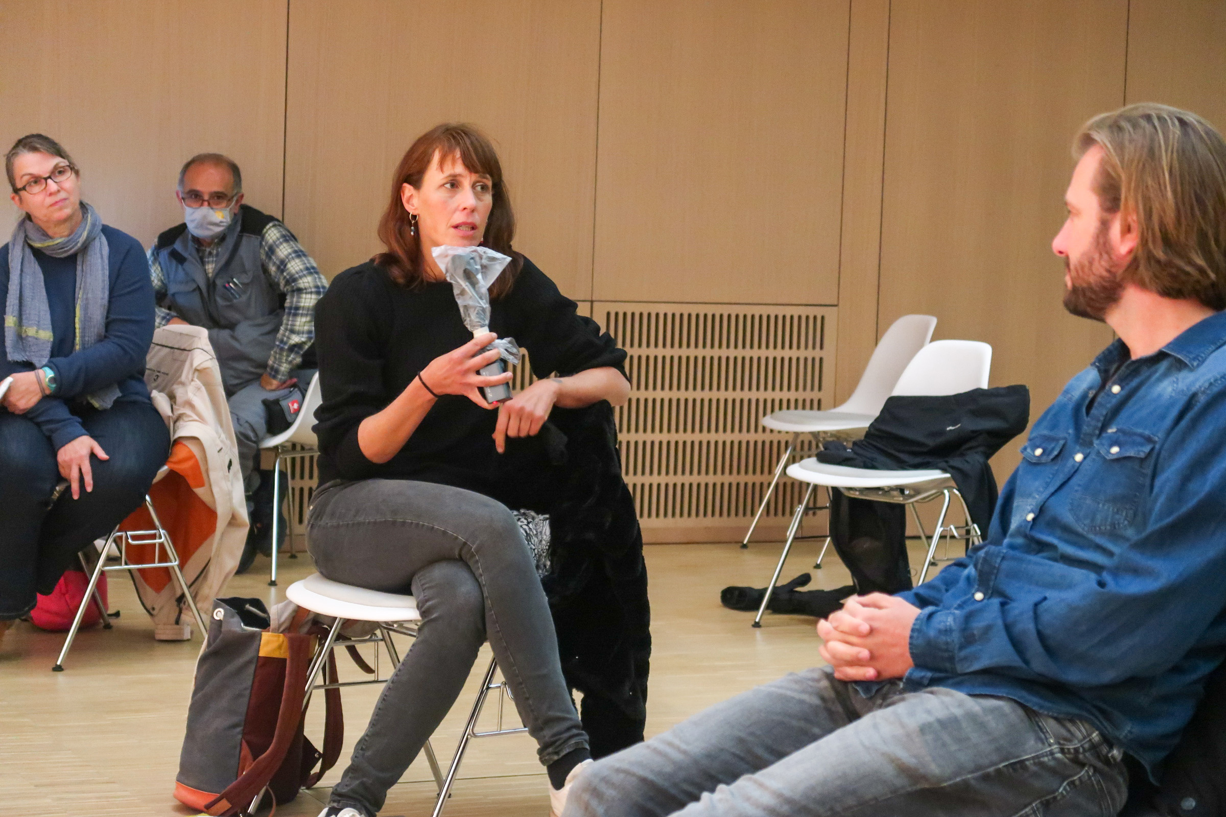 Im anschließenden Gespräch konnten die beiden künstlerischen Leiterinnen erklären, wie sie die heterogene Gruppe aus Schüler*innen verschiedenerer Schulen und Klassenstufen zusammenstellen, wie künstlerische Prozesse mit der Gruppe entstanden sind, welche Faktoren zum Gelingen des Projekts beigetragen haben, aber auch welche Schwierigkeiten z.B. in der Zusammenarbeit mit mehreren Schulen entstehen können.